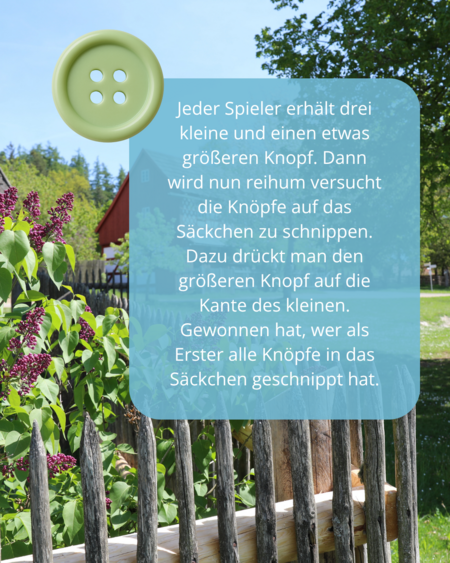 Jeder Spieler erhält drei kleine und einen etwas größeren Knopf. Dann wird nun reihum versucht die Knöpfe auf das Säckchen zu schnippen. Dazu drückt man den größeren Knopf auf die Kante des kleinen. Gewonnen hat, wer als Erster alle Knöpfe in das Säckchen geschnippt hat.