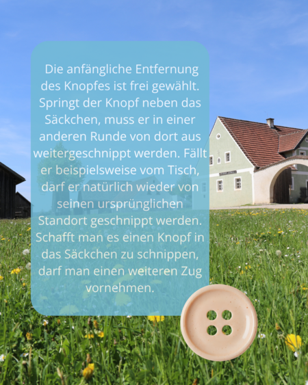 Die anfängliche Entfernung des Knopfes ist frei gewählt. Springt der Knopf neben das Säckchen, muss er in einer anderen Runde von dort aus weitergeschnippt werden. Fällt er beispielsweise vom Tisch, darf er natürlich wieder von seinen ursprünglichen Standort geschnippt werden. Schafft man es einen Knopf in das Säckchen zu schnippen, darf man einen weiteren Zug vornehmen.